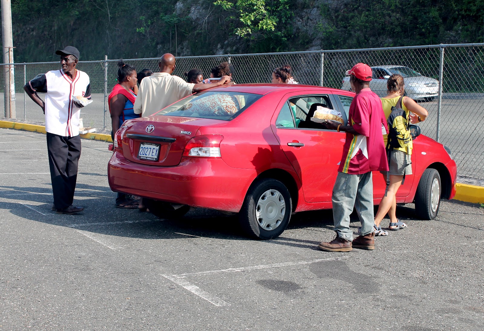 We stopped for sustenance at the Pourus jerk centre. You cannot even get out of the car! The vendors don't wait for you - they swarm your car and it is difficult to even get out.